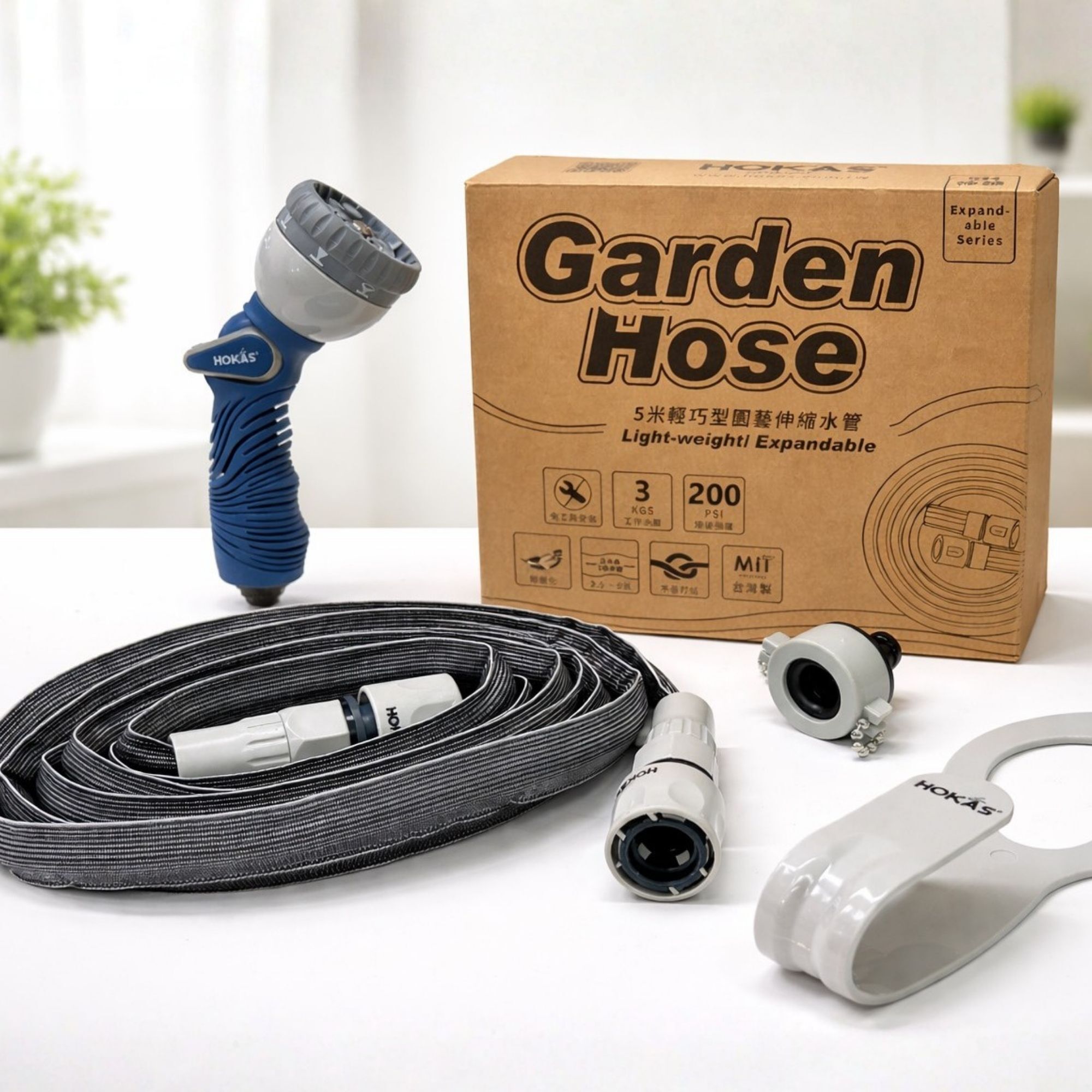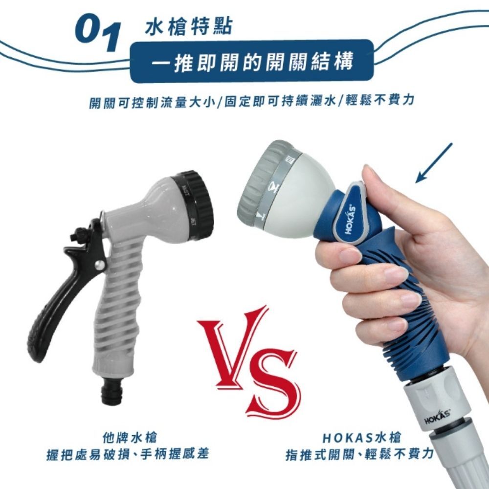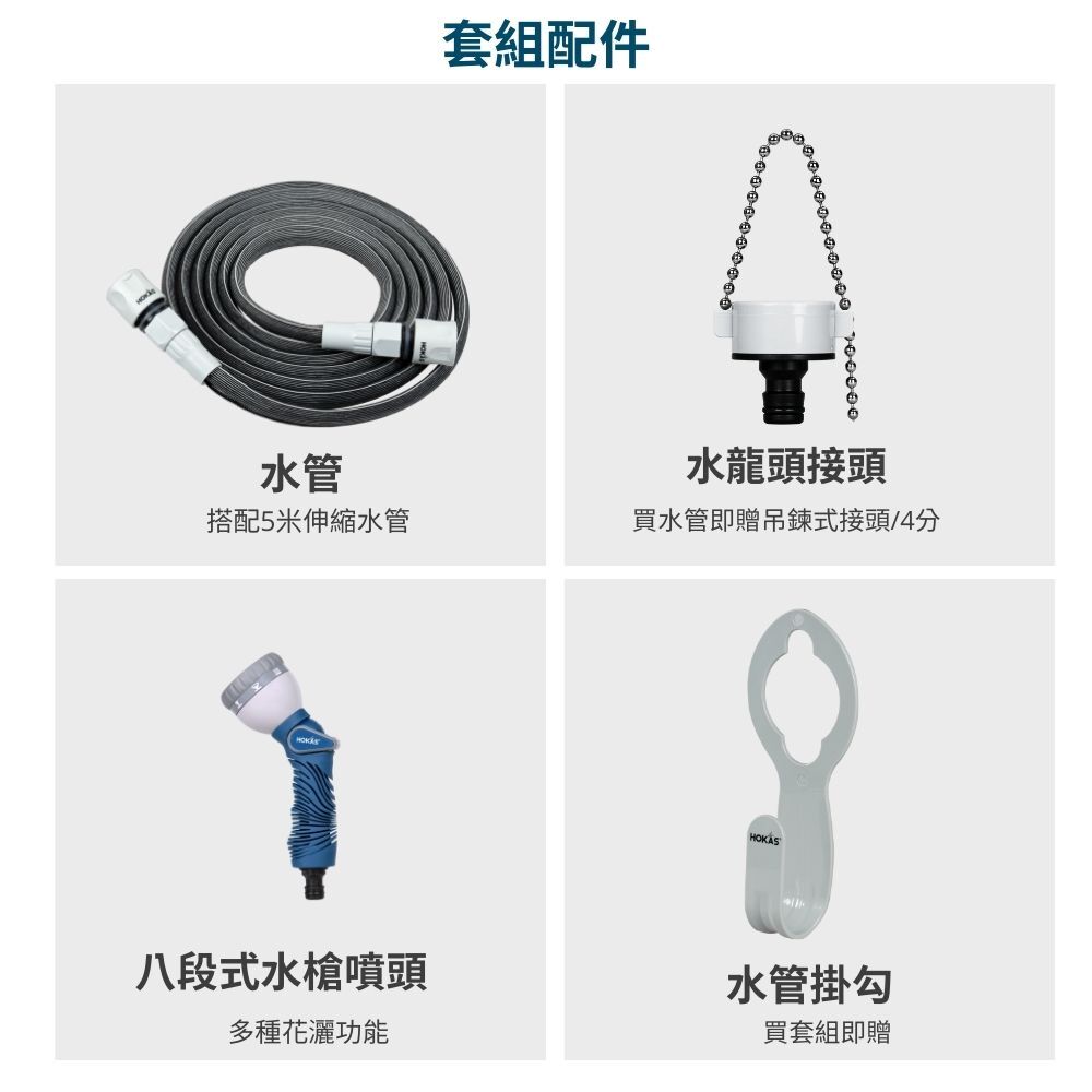 HOKAS最新型噴水槍套組、搭配八段灑水噴頭。